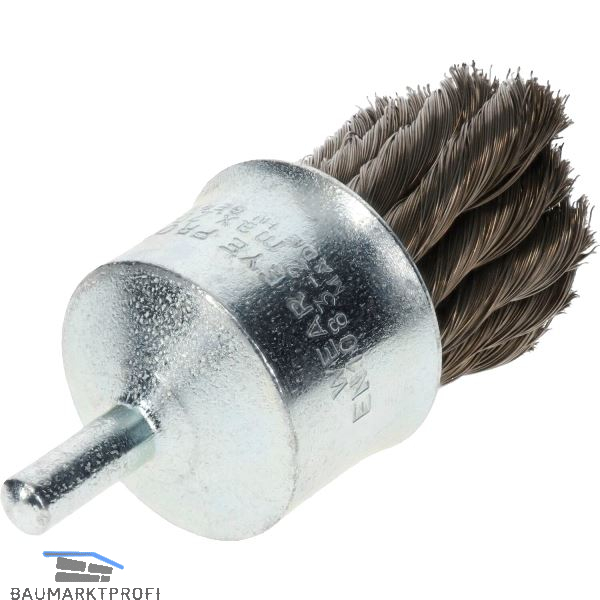 Gezopfte Pinselbürste in Industriequalität für den Einsatz auf schnelllaufenden Maschinen. Der Durchmesser der Bürste verändert sich mit zunehmender Arbeitsdrehzahl; die Bürste spreizt sich auf, so dass sich unterschiedliche Bohrungsdurchmesser bearbeiten lassen. Zum Entrosten, Entlacken, Entgraten, Schweißnähte.