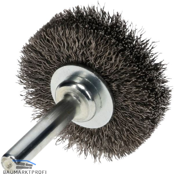 Gewellte Rundbürste in Industriequalität für den Einsatz auf Bohrmaschinen und schnelllaufenden Maschinen. Zum Bearbeiten von Bohrungen, Kanten verrunden, Entgraten und leichte Reinigungsarbeiten.