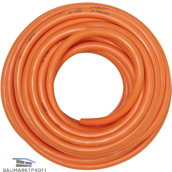 Baustellenleitung orange mit gummiisolierten Adern nach DIN VDE 0282-10. Verzinnte oder unverzinnte, feindrähtige Kupferleitung, Aderisolation aus Gummimischung EL 6, Adern gemeinsam verseilt, innere Schutzhülle. Außenmantel aus PUR, ölbeständig. Als Anschluss- und Verbindungsleitung für hohe mechanische Beanspruchung in trockenen, feuchten und nassen Räumen, sowie im Freien geeignet. Temperaturbereich: -40ºC bis +90ºC.