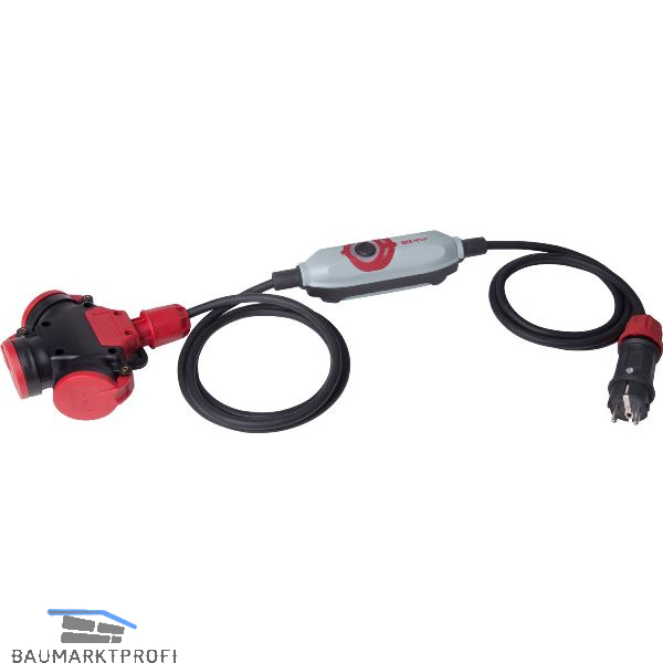 Mobiler Stromunfallschutz zwischen Steckdose und Gerät. Personenschutz-Schalter mit montiertem Vollgummistecker und 3-fach Vollgummikupplung IP 44. Bei jedem Einschaltvorgang und während des Betriebs findet automatisch die Überprüfung der korrekten Anschlussbedingungen statt. Erkennung von anlegeseitigen Leitungsunterbrechungen sowie Verdrahtungsfehler.
