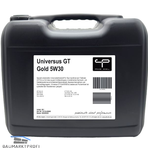 Anwendung: Speziell entwickelter Universalschmierstoff für Baumaschinen und Traktoren (UTTO) zur Schmierung und Kraftübertragung in kombinierten Hydraulik- und Getriebesystemen einschließlich Nassbremsen, Baumaschinenachsen und Hydraulikaggregaten. Universus GT Gold 5W30 ist bestens als Problemlöser bei quietschenden Nassbremsen geeignet.