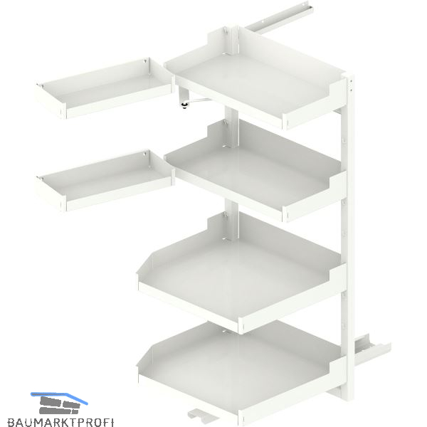 Der Beschlag trägt die Einhängetablare und befördert sie aus dem Möbel.