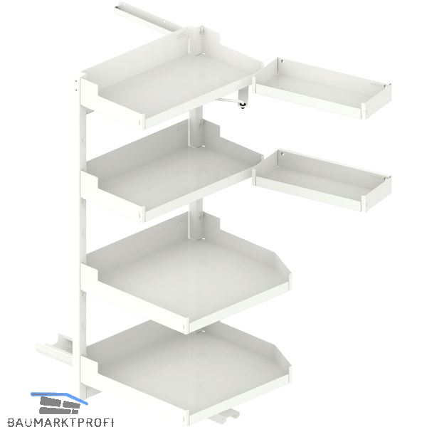 Der Beschlag trägt die Einhängetablare und befördert sie aus dem Möbel.