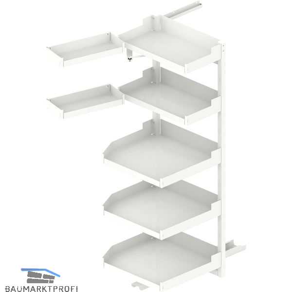 Der Beschlag trägt die Einhängetablare und befördert sie aus dem Möbel.