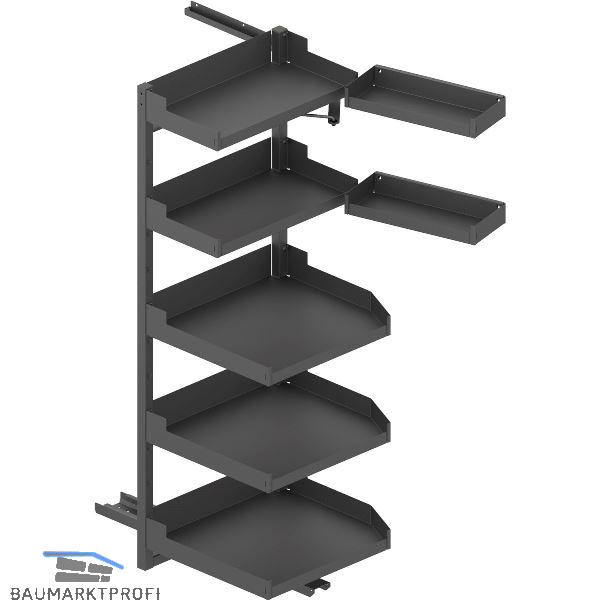 Der Beschlag trägt die Einhängetablare und befördert sie aus dem Möbel.