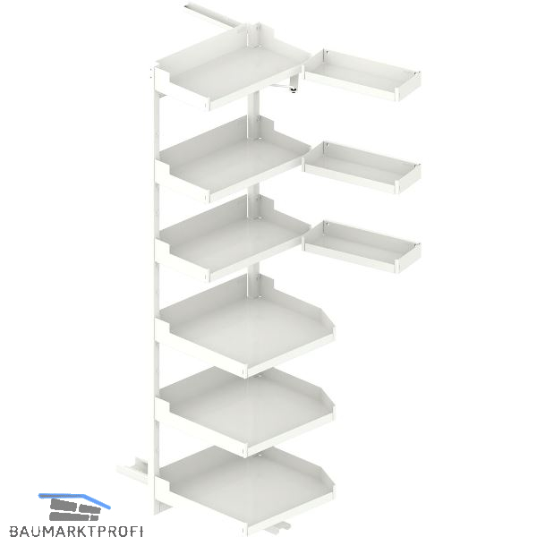 Der Beschlag trägt die Einhängetablare und befördert sie aus dem Möbel.