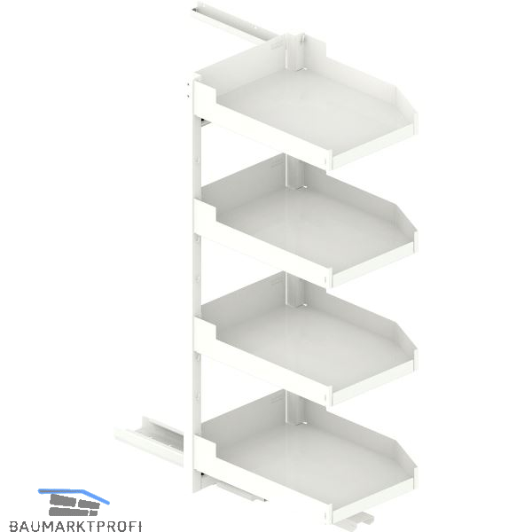 Der Beschlag trägt die Einhängetablare und befördert sie aus dem Möbel.