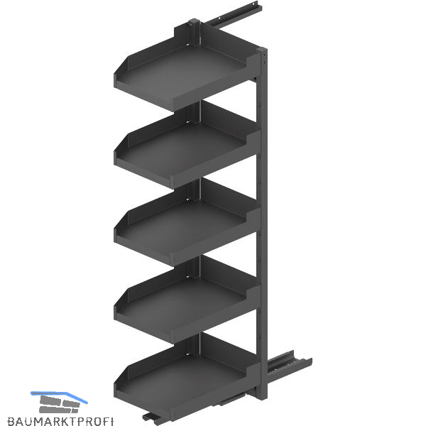 Der Beschlag trägt die Einhängetablare und befördert sie aus dem Möbel.
