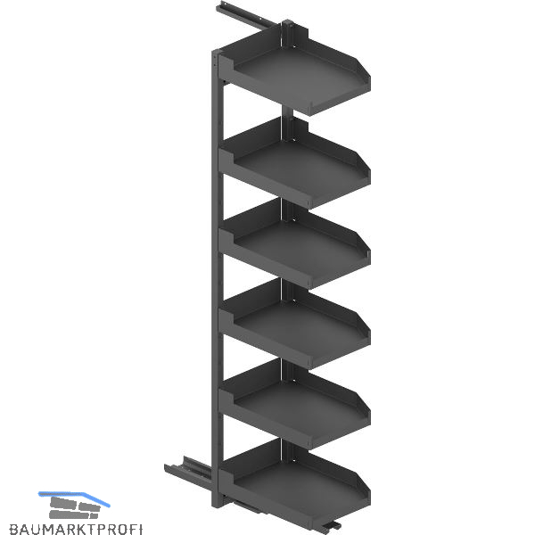 Der Beschlag trägt die Einhängetablare und befördert sie aus dem Möbel.