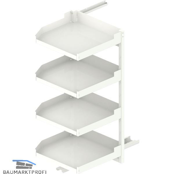 Der Beschlag trägt die Einhängetablare und befördert sie aus dem Möbel.