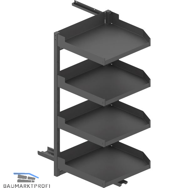 Der Beschlag trägt die Einhängetablare und befördert sie aus dem Möbel.