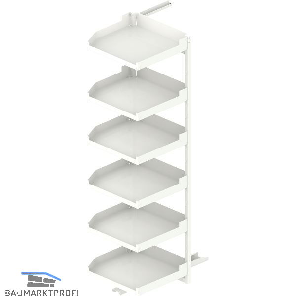 Der Beschlag trägt die Einhängetablare und befördert sie aus dem Möbel.