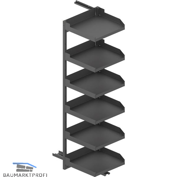 Der Beschlag trägt die Einhängetablare und befördert sie aus dem Möbel.