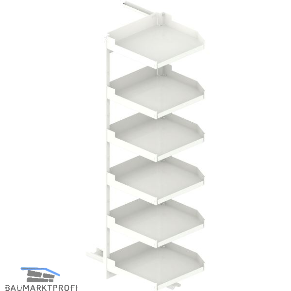 Der Beschlag trägt die Einhängetablare und befördert sie aus dem Möbel.