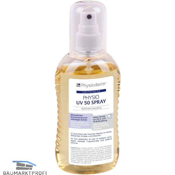 PHYSIO UV 50 SPRAY wird an Arbeitsplätzen im Freien mit mittlerer bis sehr hoher natürlicher UV-Strahlung eingesetzt. Die Rezeptur kann einen Beitrag zum Zellschutz vor sich unter UV-Licht bildenden Radikalen liefern und ist feuchtigkeitsspendend. Sie vermindert die sonnenbedingte vorzeitige Alterung der Haut.