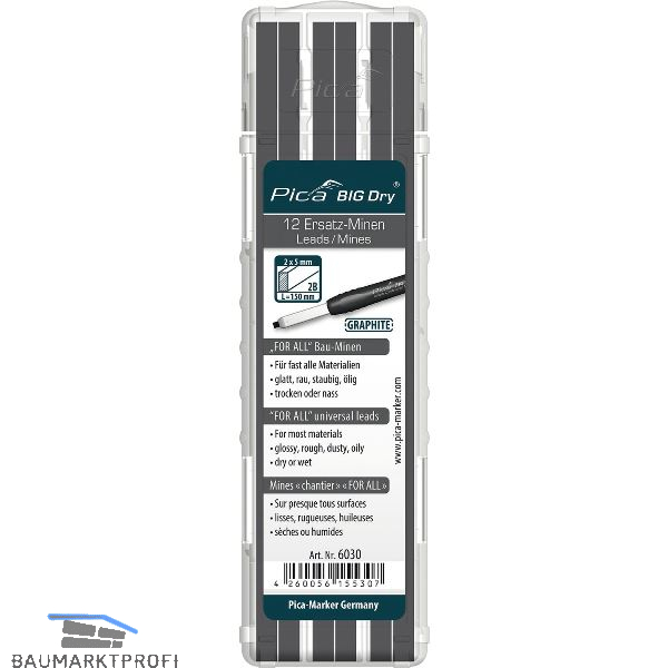 Rechteckminen mit 2 x 5 mm Querschnitt, 150 mm lang. Universell - für fast alle Materialien geeignet ob trocken oder nass, glatt oder rau, staubig oder ölig. Von glatten Flächen feucht abwischbar. Schlägt beim Überstreichen mit Dispersionsfarbe nicht durch.