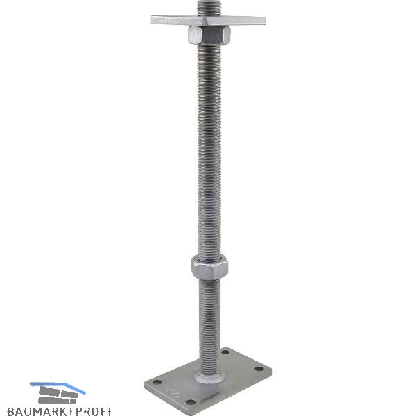 Pfostenträger verstellbar mit Gewindestangen zum Aufdübeln sind zur Aufnahme von vertikalen und horizontalen Lasten geeignet. Obere Platte auf Anfrage mit Mutter verschweißt, oder mit Sicherungslasche erhältlich.