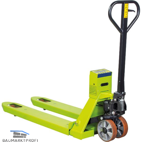 Der Wiegehubwagen ist eine einfache, robuste und preiswerte Maschine zum Heben und Wiegen von Transportladungen. Dank der 4 Ladezellen ist der Wiegevorgang einfach und funktionell. Ein ideales Werkzeug zur Überprüfung des Wareneingangs, zur Vermeidung von Überlast und zur Ermittlung des Versandgewichtes. Das große 6-stellige LCD Display bietet ein genaues und präzises Wiegeergebnis in kg und lb. Die Einstellung der Tara zeigt sowohl das Brutto- als auch das Nettogewicht an. Das Gewicht wird in 0,5/1 kg/lb Steps mit einer Genauigkeit von 0,05% Abweichung angegeben. Die Struktur basiert auf einem Doppelrahmenprinzip in Verbindung mit einer niedrigen Gabel, welche jeweils über zwei integrierte Wiegezellen verfügt. Durch die Verwendung von insgesamt vier Wiegezellen und einer hochwertigen Elektronik wird selbst bei ungleichmäßig beladenen Paletten ein präzises Wiegeergebnis erzielt. Die Elektronik wird von einer 4x AA Standardbatterie angetrieben, welche in ein bestimmtes Modul eingebaut wird. Die Betriebszeit beläuft sich auf 30 Stunden. Ausgestattet mit Nylon - Polyurethan Lenkrollen und Polyurethan Tandem Lastrollen.