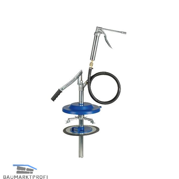Abschmiergerät mit Handpumpe und Hochdruck-Einhand-Fettpresse, durch Schnellkupplung abnehmbar. Komplett mit Folgekolben, Staubdeckel, Befestigungsstern und Förderschlauch 1,5 m. Pumpleistung ca. 30 cm3. Hochdruck-Einhand-Fettpresse 125 cm3, mit geradem Düsenrohr und 4-Backen-Hydraulikgreifkopf. Arbeitsdruck 260 bar, Höchstdruck 520 bar. Empfohlen für Schmierstoffe bis Konsistenzgrad nach NLGI.