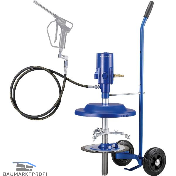Für den wirtschaftlichen Abschmierdienst in Fuhrparks, Landwirtschafts-, Bau- und Industriebetrieben und im Werkstattbereich. Pneumatik-Fettpumpe 50:1, Schöpfwerk, Staubdeckel, Fettfolgekolben und Behälterbefestigung. Hochdruck- Fettpistole, Z-Drehgelenk, Hochdruckschlauch 2 m (außer Größe 50 kg mit 4 m Hochdruckschlauch), Druckreduzierventil (auf 8 bar fest eingestellt), Stecknippel. Inkl. Fahrwagen (außer Größe 5 kg).