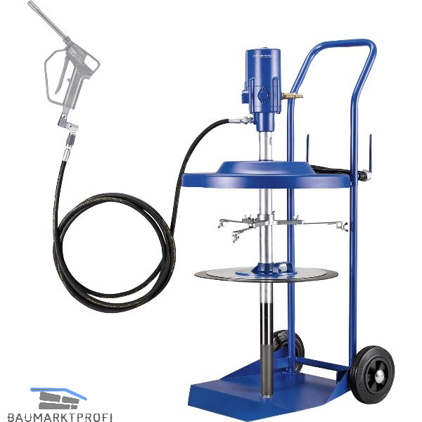 Für den wirtschaftlichen Abschmierdienst in Fuhrparks, Landwirtschafts-, Bau- und Industriebetrieben und im Werkstattbereich. Pneumatik-Fettpumpe 50:1, Schöpfwerk, Staubdeckel, Fettfolgekolben und Behälterbefestigung. Hochdruck- Fettpistole, Z-Drehgelenk, Hochdruckschlauch 2 m (außer Größe 50 kg mit 4 m Hochdruckschlauch), Druckreduzierventil (auf 8 bar fest eingestellt), Stecknippel. Inkl. Fahrwagen (außer Größe 5 kg).