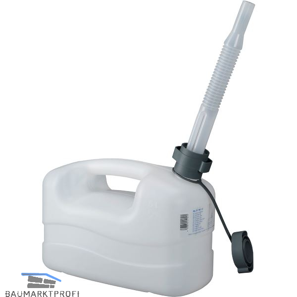 Aus Polyethylen mit flexiblem Auslaufrohr und integrierter Entlüftung. Auslaufrohr wird im Kanister aufbewahrt, Verschlusskappe mit Fixierband gegen Verlust gesichert, Lebensmittelecht, robust und unempfindlich gegen Schlageinwirkung.