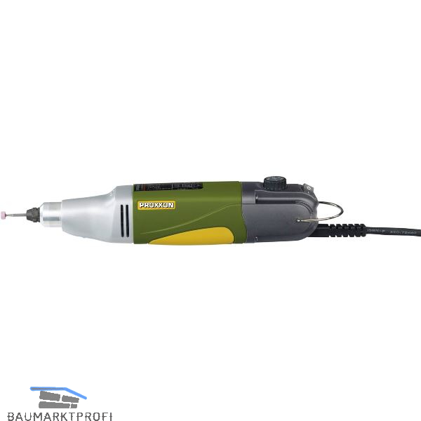 Balancierter DC-Spezialmotor. Durchzugkräftig und langlebig. Doppelt kugelgelagerte Spindel aus geschliffenen Stahl. Zum Werkzeugwechsel mit Knopfdruck arretierbar. Schlanker Gehäusekopf aus Alu-Druckguss. Vollwellenelektronik, Schutzisolation nach Klasse 2. Ideal zum Bohren, Fräsen, Schleifen, Trennen, Gravieren und Signieren. Für Feinmechaniker, Modellbauer, Schmuckwerkstätten und Elektroniker.