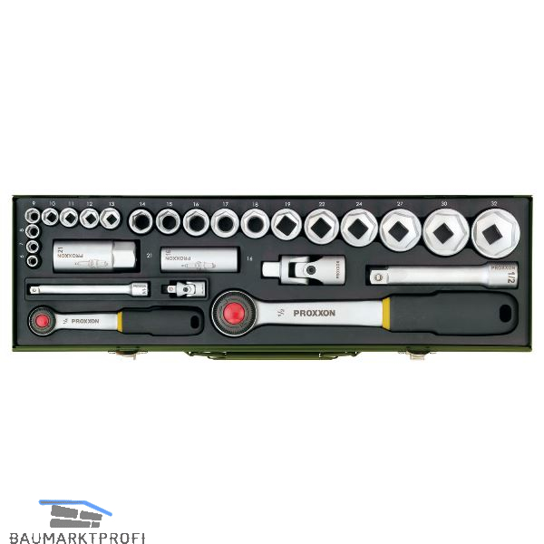 PKW-Steckschlüsselsatz mit 1/4" und 1/2" Ratsche für alle wichtigen PKW-Schrauben von 6-32 mm. Lieferung im stabilen Stahlkasten.