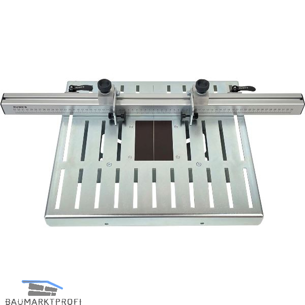 1x Aufspannplatte mit Splitterschutz inkl. Montageträger, Anschlagschiene mit gelaserter Maßskala, 1x Anschlag mit Feineinstellung links, 1x Anschlag mit Feineinstellung rechts