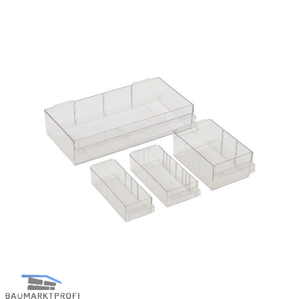 Aus Polypropylen (PP), Etikettenhalter ermöglichen eine Beschriftung. Eine Sperrnase verhindert das Herausfallen der Schubladen, ohne Trennwände.