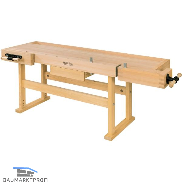 Preisgünstige, traditionelle Hobelbank aus massivem Buchenholz, 2 Holzzangen und Schublade. Massive 500 x 165 mm Vorderzange mit Stahlführung, 470 x 250 mm Hinterzange mit Parallelstabführung und 2 Löchern für Bankhaken. Zusätzlich noch 9 Löcher auf der lackierten Platte.