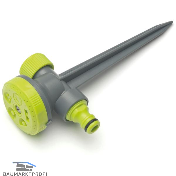 Regner zur kreisrunden Bewässerung einer Fläche von bis zu 70 m² (Durchmesser 9,5 m) bei nur 3,5 bar notwendigem Wasserdruck. Anschließbar an alle marktüblichen Kunststoffsysteme.