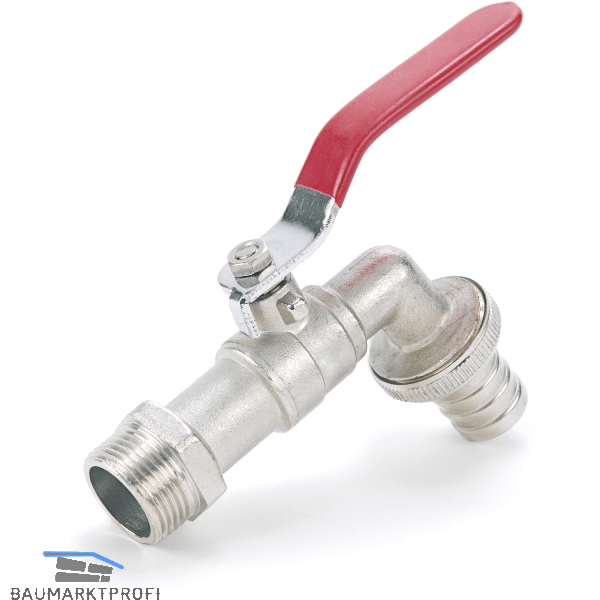 Auslaufventil mit 2-tlg. Schlauchverschraubung, flachdichtend aus Messing. Mit verzinktem Stahlhebel, rot lackiert. Max. Betriebsdruck 8 bar.
