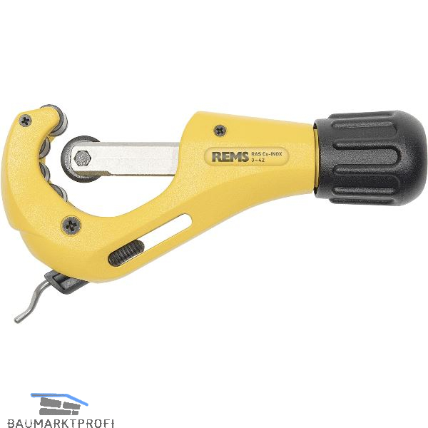 Teleskopspindel. Leichtes, schnelles Verstellen in beiden Richtungen. Stabile Teleskopspindel, lange Spindelführung und 4 spezialgehärtete Gegendruckrollen für genaue Führung am Rohr, leichtes Zustellen, leichtes Schneiden und präzisen, rechtwinkligen Schnitt. Ergonomischer Drehgriff aus Metall für leichtes Arbeiten. Speziell gehärtetes Schneidrad aus zähhartem REMS Schneidbackenstahl. Schneller, werkzeugloser Schneidradwechsel durch Schneidradachse mit Kugelrastung. Schneidrad durch Begrenzung der Zustellbewegung vor Berührung mit den Gegendruckrollen geschützt. Mit integriertem Rohrentgrater.