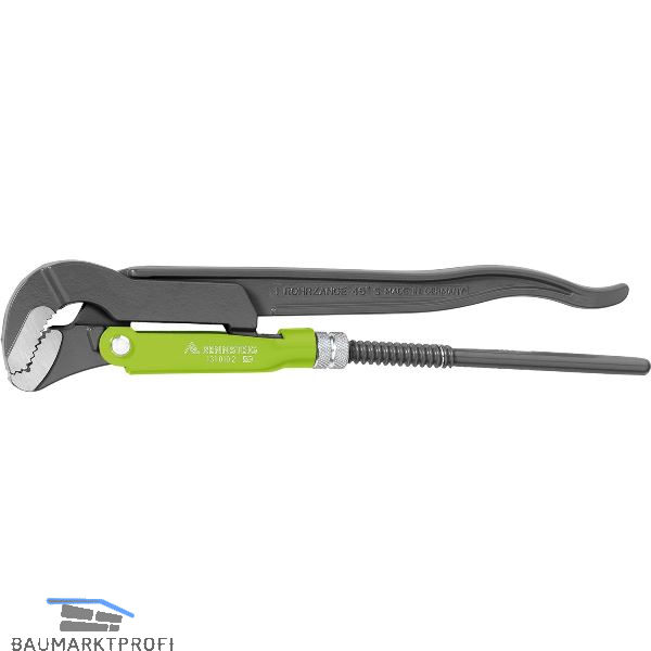 Geschmiedet und vergütet, Verzahnung zusätzlich induktiv gehärtet. Gegen die Drehrichtung versetzte Verzahnung. Zangenhebel aus Doppel-T-Profil. Verstärkte Schelle, Stellmutternsicherung, Klemmschutz, pulverlackiert, Zangenspiegel geschliffen. 45º abgewinkeltes Zangenmaul.