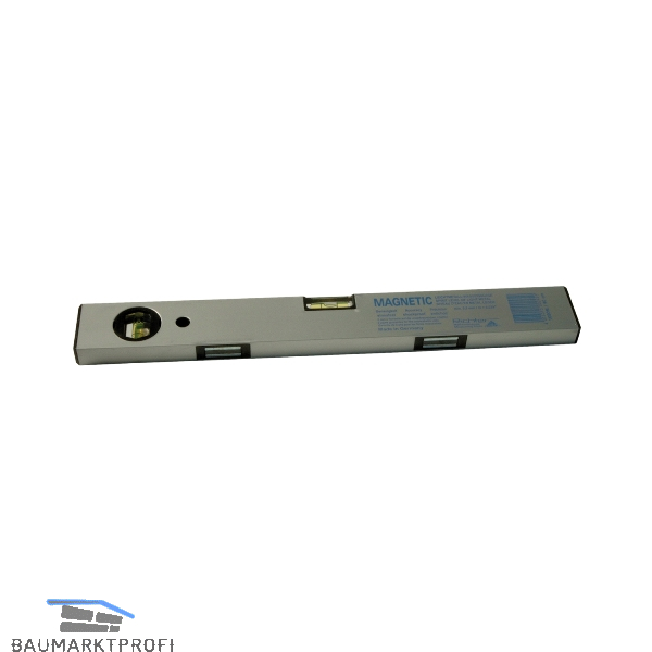 Gezogenes Leichtmetallprofil, silberfarbig eloxiert, tonnenförmige Horizontal- und Vertikallibelle aus unzerbrechlichem Acrylglas fest in den Wasserwaagenkörper eingeklebt. In die Auflagefläche sind je nach Länge der Wasserwaage eine unterschiedliche Anzahl der besonders stark haftenden Magneten eingebaut für guten Halt an allen magnetischen Flächen auch an lackierten und runden Gegenständen. Genauigkeit: mind. 0,5 mm/m = 0,029º.