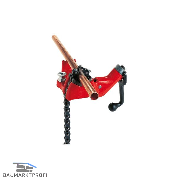 Robuster Gusseisensockel, Backen aus gehärtetem legierten Stahl, Rohrauflage und Biegevorrichtung. Die zahnlosen Backen sind neoprenbeschichtet.