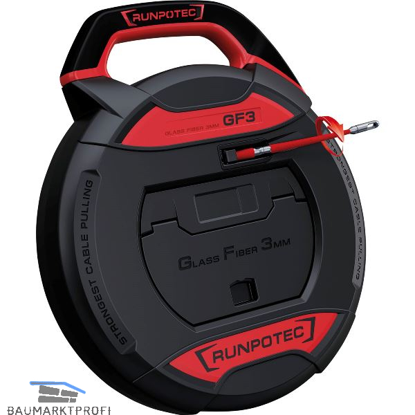 GF3 - Kabeleinziehgerät ohne digitalem Meterzähler, Glasfaserstab Ø 3 mm mit Knickschutz-Endhülse (Innengewinde RTG Ø 6 mm) und patentierter Führungsspitze mit Drallausgleich (2 x Außengewinde RTG Ø 6 mm). Verstaut in einer spritzwasser- und staubgeschützten, stoßfesten Kunststoffbox mit Tragegriff und Anti-Rutsch Beschichtung, welche sich mit nur einer Schraube für Servicearbeiten öffnen lässt. Die Rückschub-Sicherung verhindert das unabsichtliche Rückrutschen des Glasfaserstabes. Die neu entwickelte Knickschutztechnik ermöglicht das Überwinden von Biegeradien bis zu R = 38 mm. Die Gesamtbruchlast von 130 kg bezieht sich auf den Glasfaserstab inkl. Knickschutzhülsen. Die inkludierte Kabelziehschlaufe (Ø 14 mm Außen) mit eingebautem Drallausgleich und Schutzkappe kann für ein oder mehrere Kabel bis zu einem Kabeldurchmesser von Ø 12 mm verwendet werden. Eventuelle Stecker werden durch Zugbelastung am Kabel geschont.