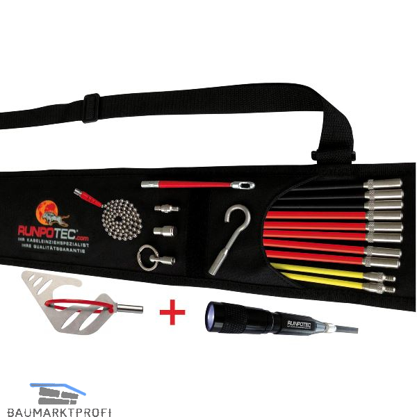 Die neue Basalttechnologie ermöglicht extreme Biegeradien, dennoch bleiben die Stäbe sehr formstabil. Alle Verbindungen haben ein RUNPOTEC Gewinde RTG Ø 6 mm und keine Stoßkanten oder Gewindeübergänge. Mit dem Magneten lassen sich Gegenstände bis zu 2,5 kg halten. Die Kugelkette ermöglicht in Kombination mit dem Magneten ein gezieltes Orten bzw. das Führen zu Wand- und Maueröffnungen. Zusätzlich ist im Comfortpaket der Spezial Gleithaken enthalten welcher durch die Kippfunktion Hindernisse mit bis zu 6,5 cm Höhe mühelos überwinden kann. Die ebenfalls enthaltene stoßfeste LED Lampe hat eine sehr hohe Leuchtkraft und extrem lange Leuchtzeit durch AAA Duracell-Batterien. In der praktischen Aufbewahrungstasche mit Tragegurt kann das komplette Zubehör perfekt verstaut werden.
