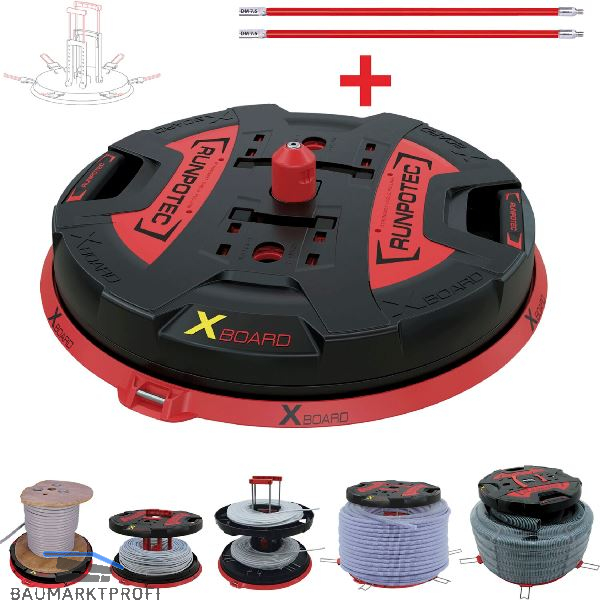 Universeller Profi-Kabeltrommel-Auf- und Abroller für alle Arten von Kabeln und Rohren. Ermöglicht störungsfreies und rationelles Arbeiten ohne Kabelgewirr. Bis zu 800 kg belastbar und passt nahezu für jede Trommelart. Besonders gut geeignet für beschädigte Kabeltrommeln. Der Deckel ist bis zu einer Füllhöhe von 390 mm verstellbar, dadurch perfekt konstruiert um lose Kabel, Kabelringe oder Rohre zu sichern. Verhindert dadurch unkontrolliertes Kabelabwickeln. Die 6 ausklappbaren Auflageverbreiterungen können durch die Teleskopauszüge bis zu Ø 800 mm ausgezogen werden. Im Deckel verstaute RUNPOSTICKS (2 x 410 mm, Ø 7,5 mm) können an das Gewinde des Edelstahlmitteldorn angeschraubt werden. 12 gummierte Standfüße. Optimal zum Schutz von Oberflächen für bereits fertige Bodenbeläge.