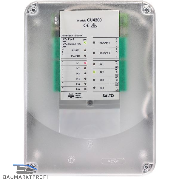 Benötigt keine eigene IP-Adresse. Untergeordnete Steuerung mit der SALTO Online- Steuerung CU42E0 oder Offline-Steuerung als Teil des SALTO Virtual Network (SVN). Zur Verwendung mit den SALTO Wandleser Mifare XS4 2.0. Anschluss von 2 Wandlesern, die entweder für unterschiedliche Türen genutzt werden können (nur im Online-Betrieb als Erweiterungssteuerung mit einer CU42E0TEU) oder zur Ein- /Ausgangssteuerung einer Tür. Anti-Passback-Modus beim Anschluss von 2 Wandlesern für eine Tür. Sämtliche Kommunikation mit der Steuerung CU4200TEU erfolgt verschlüsselt.