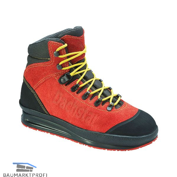 Trekking-Konstruktion mit gepolsterter Leder/Cordura-Staublasche und seitlichem Knöchelstabilisator. Hohe Schuhbelüftung durch perforierten Walkbereich (Schuh Innenseite). Rostfreie Metallösen mit Klemmöse am Rist und Rundschnürsenkel. Nahtfreie Anstoß-Gummikappe, Längswölbenstütze durch eingearbeitete Gelenksfeder - ideal für Dacharbeiten und beim Stehen auf Leitersprossen. Nitril-Gummi Laufsohle - hitzebeständig bis max. 220ºC mit hochgezogener Bandage zum Schutz des Oberleders. Integrierte Ballenrolle für optimalen Halt und geschmeidiges Abrollen sowie exzellenter Fersendämpfung und nicht kreidender roter Gummi-Laufschicht, öl- u. benzinresistent, besonders rutschhemmend nach SRC.