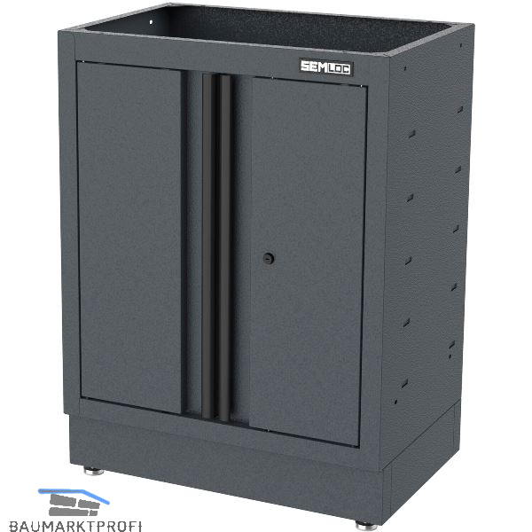 Flügeltürschrank aus hochwertigem Stahl mit einer robusten Pulverbeschichtung in Industriequalität. Mit schwarzem Schloss sowie schwarzer Aluminiumgriffleiste.