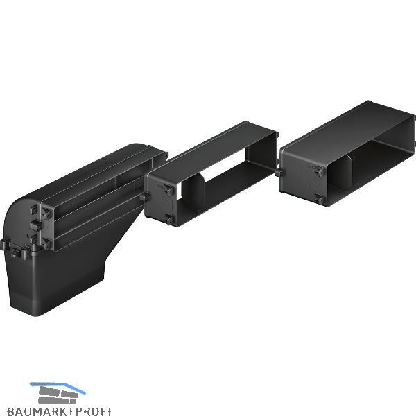 Bestehend aus: 3 zusammensteckbare Tiefenadapter (40mm, 80mm, 120mm) für Arbeitsplattentiefen von 600 - 750mm, 90° Umlenkstück, Verbindungsstück für weitergehende Verrohrungen mit 220 x 90 mm Flachkanäle