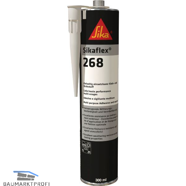 Sikaflex®-268 ist ein elastischer, hochbelastbarer, toleranzausgleichender 1-Komponenten-Polyurethan-Klebstoff, der mit Luftfeuchtigkeit zu einem Elastomer aushärtet. Sikaflex®-268 hat eine sehr gute Witterungsbeständigkeit und ist gegen viele Reinigungsmittel resistent. Daher eignet er sich sehr gut als Sichtfugenmaterial. Sikaflex®-268 ist geeignet für die Verklebung von großen Bauteilen und die Direktverglasung von Schienen- und sonstigen Nutzfahrzeugen sowie deren Reparatur. Es ist sehr gut zu glätten und verfügt über ausgezeichnete Verarbeitungseigenschaften.