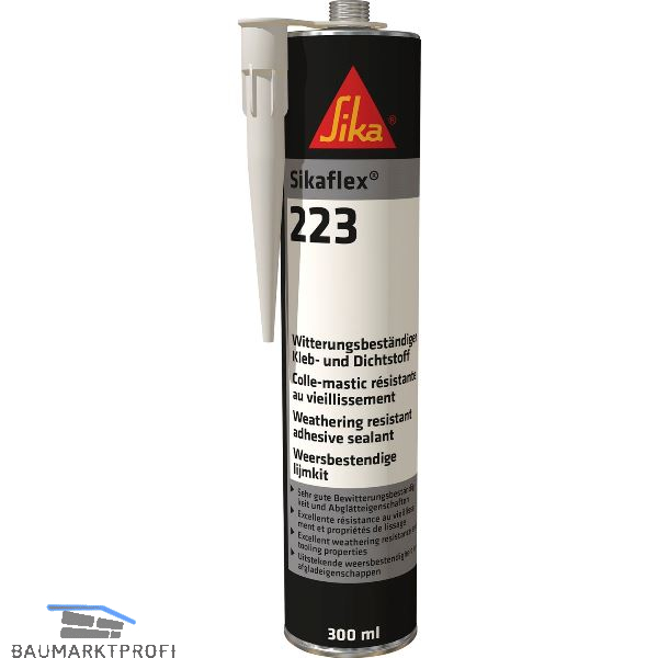 Anwendungsgebiete:Sikaflex-223 ist ein vielseitig einsetzbarer Kleb- und Dichtstoff. Das Produkt kann aufgrund seiner sehr guten Witterungsbeständigkeit für Außenfugen eingesetzt werden.
