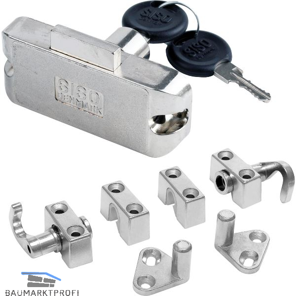 Lieferumfang:1 Drehstangen Zylinderschloss inkl. 2 Schlüssel1 Rosette1 Anschlagwinkel2 Schließhaken2 Führungen2 Schließbolzen auf Platte