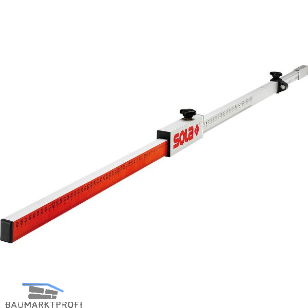 Flexilatte aus eloxiertem Aluminium mit Dosenlibelle zur Positionierung. Skalierung mm/cm, bedruckt. Transportlänge 132 cm.