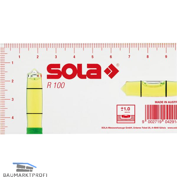 Bruchfestes, elektrisch nicht leitendes Acrylglas, aus glasklarem Block geschnitten. Präzise, CNC-gefräste Waagrecht- und Senkrechtlibelle in grün. Resistent gegen Wasser, Wärme und Kälte. Aufgedruckte Skalierung im 1-mm-Raster.