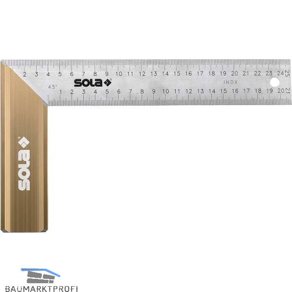 Der Winkelhaken hat einen robusten, eloxierten Aluminiumgriff in Bronze mit breitem Anschlag. Die Klinge aus rostfreiem Federstahl ist geschliffen und widerstandsfähig. Die gut ablesbare, verschleißfeste Skalierung ist zweigeteilt, mit einem Raster von 1 mm. Ein integrierter Gehrungsanschlag ermöglicht Winkeleinstellungen von 45° und 135°. Ein praktisches und langlebiges Werkzeug für genaues Arbeiten.
